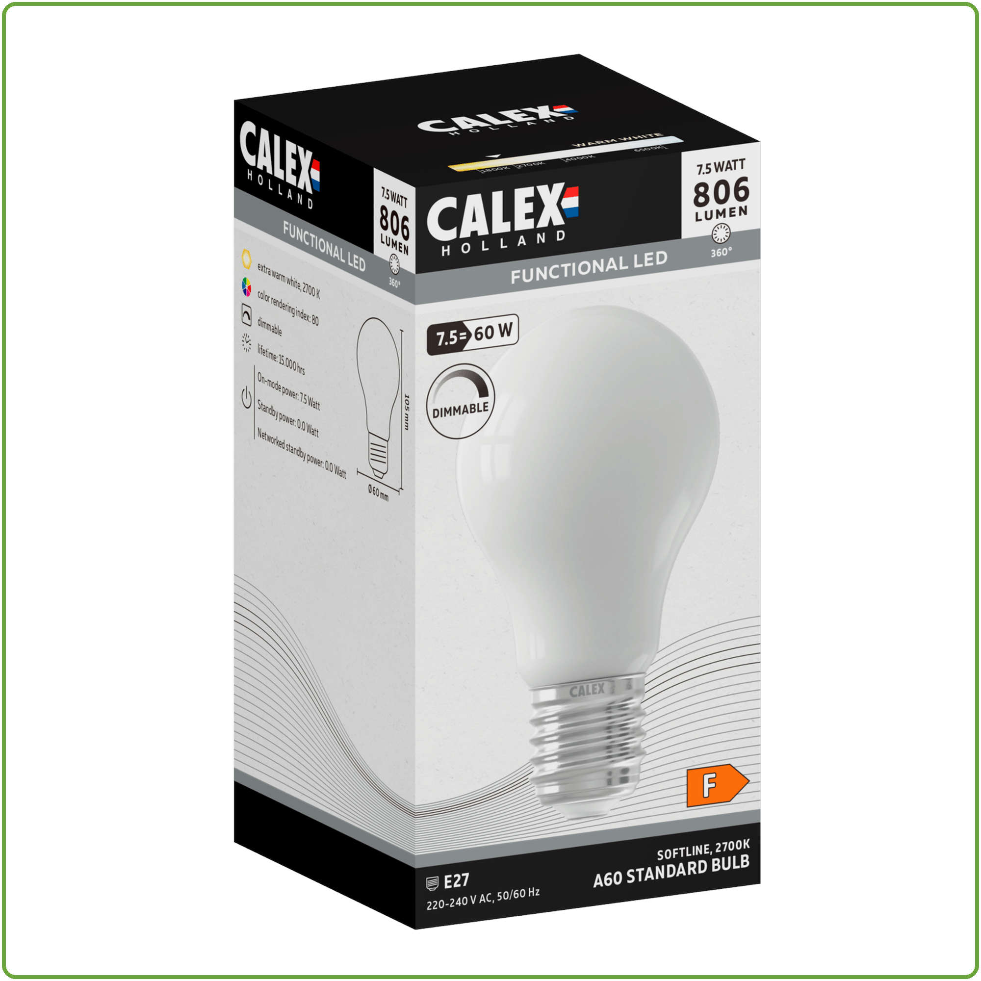 Calex Standaard A60 Softline Straight filament 220-240V 7.5W 806lm 2700K E27 Dimbaar met LED dimmer